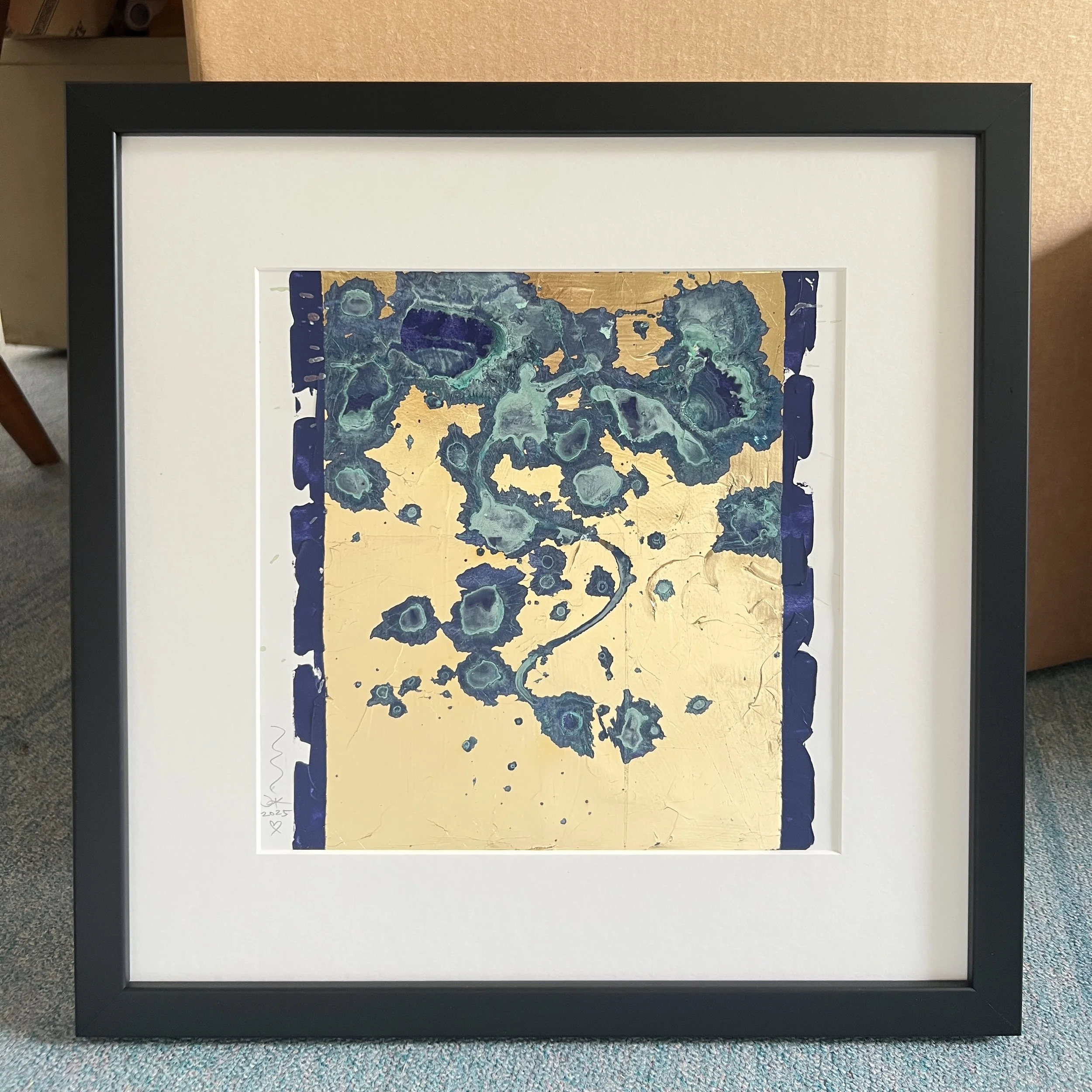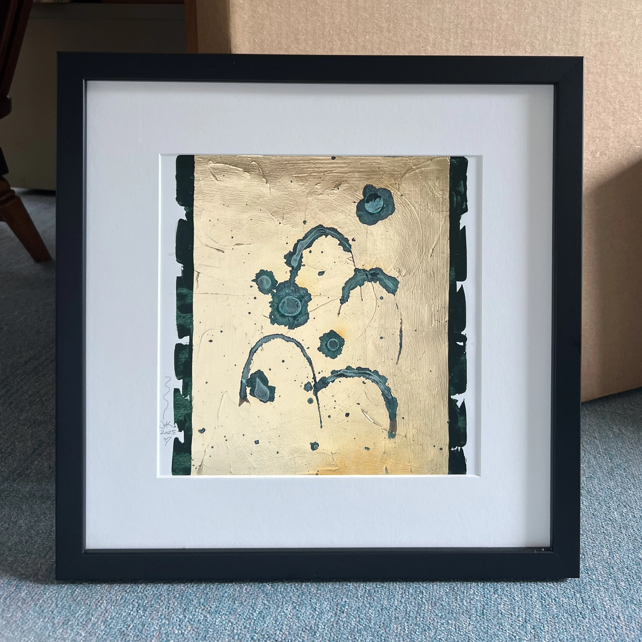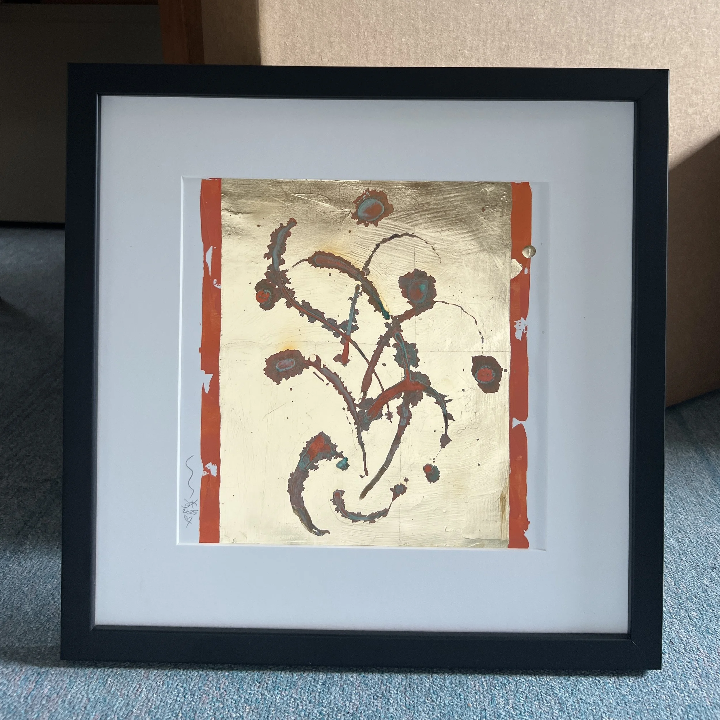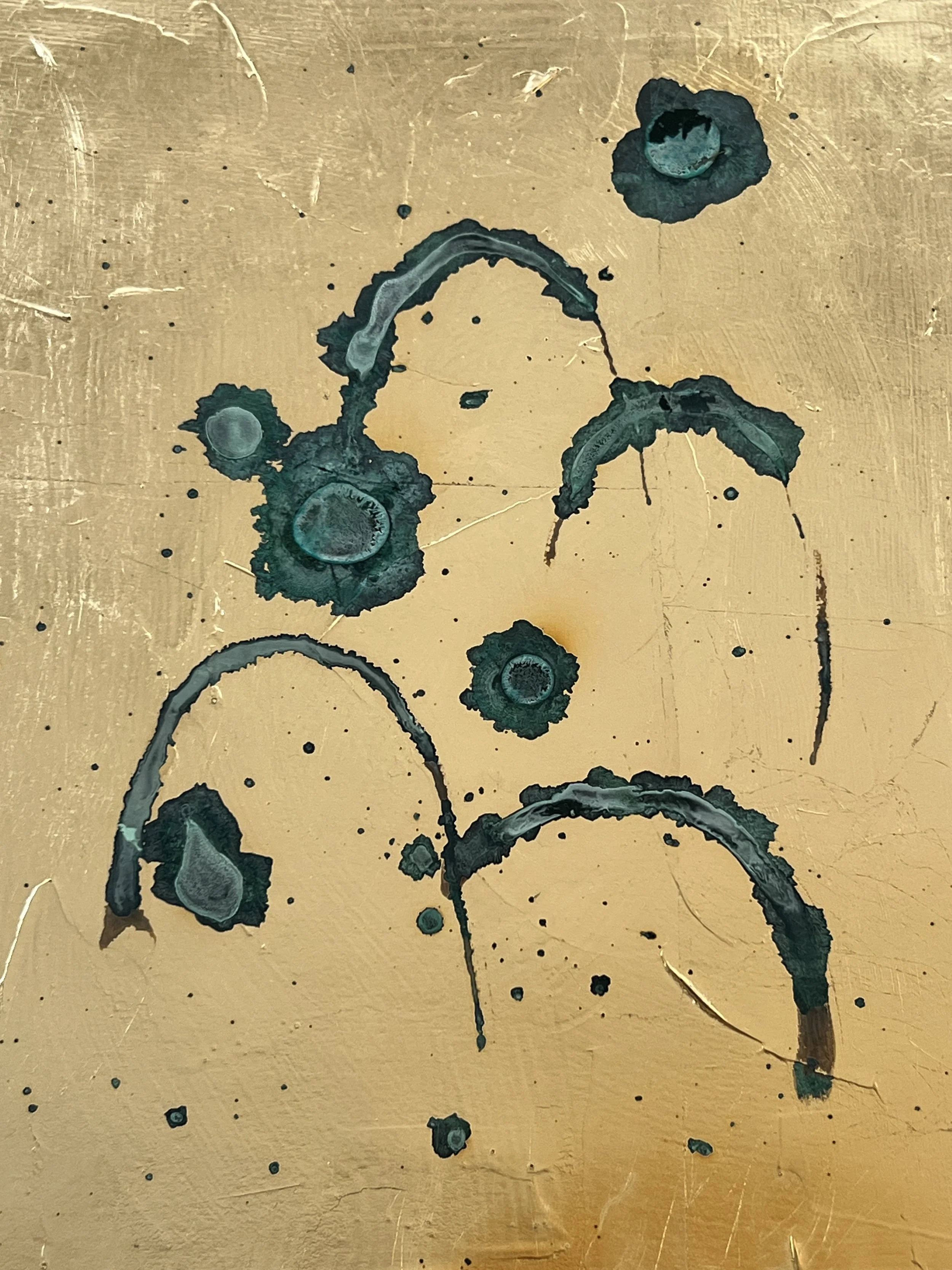 In this series, Jennifer took elements from her contemporary landscape paintings, broke them out of their mold, and remodeled them with simplification and distortion. Texture, mark making, and decisive use of color are all drawn upon to express nature themes. Each background is an expression of a single landscape element: a leaf, a blossom, the earth, a tree. A light-reflecting gilded area is patinated with lyrical lines and splashes, allowing the color to show within and around its regular, straight edge form. These works evolve over time, taking about one year to fully develop a halo around the etched areas of gilding. The combined effects of these paintings refer to the tempests, fast and slow, of nature changing and evolving over just a few generations of human life.
